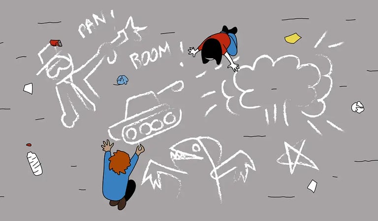 Le clip s'ouvre sur des scènes d'enfance, une cour de récréation, des dessins à la craie qui basculent rapidement vers des signes de chaos : déchets, explosions, créatures menaçantes. Cette structure narrative en embranchements transforme chaque choix du spectateur en point de dérive, créant un rythme non-linéaire proche de l'expérience de jeu vidéo.